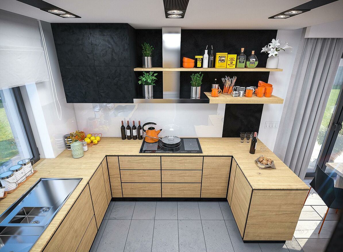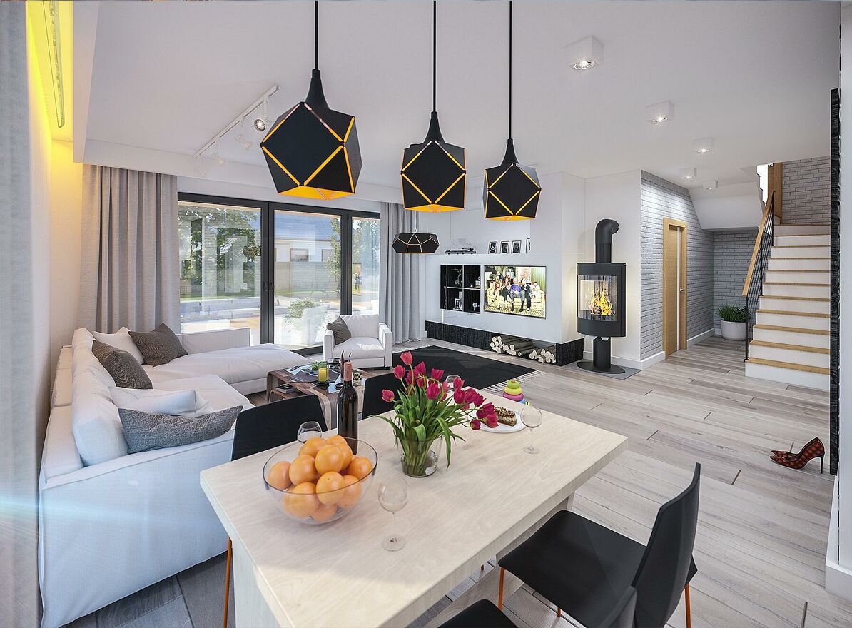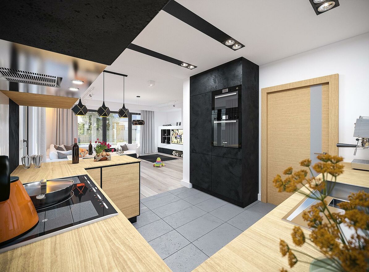 - Dach z czarnej dachówki ceramicznej idealnie komponuje się z jasną elewacją oraz elementami drewnianymi.