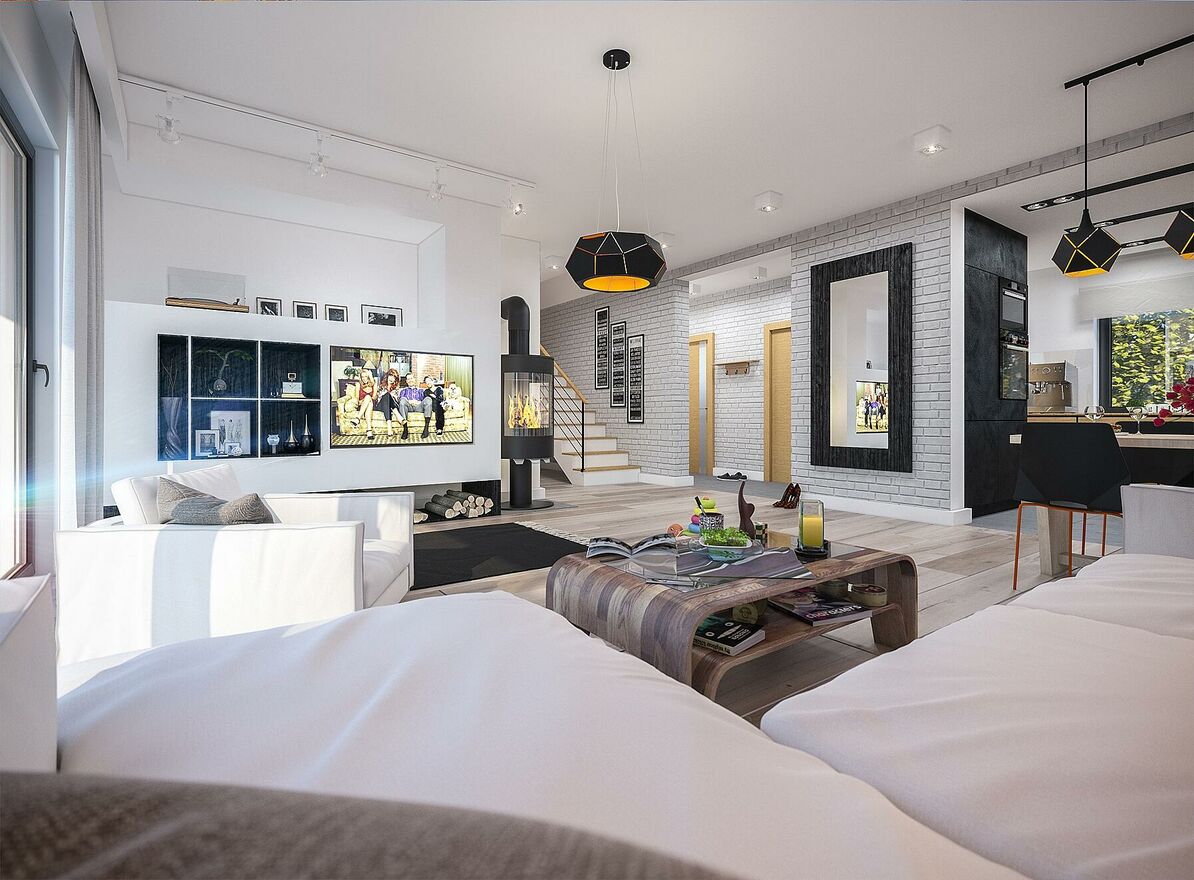 - Dodatkowo, nad garażem znajduje się duże pomieszczenie, które można zaadaptować na drugi salon, luksusową sypialnię lub miejsce zabaw dla najmłodszych.